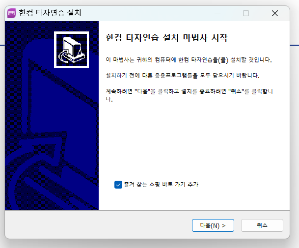 (구)한컴 타자연습 다운로드를 클릭해 프로그램을 설치시작으로 들어갑니다. 설치 마법사 시작 다음으로 클릭 후 사용권 계약사항을 동의하면 바로 설치가 완료됩니다.
