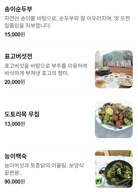 - 송이전골: 봉화의 자랑인 자연산 송이버섯이 듬뿍 들어갑니다. 자극적인 양념보다는 송이 본연의 향을 살린 맑고 깊은 국물이 특징입니다.