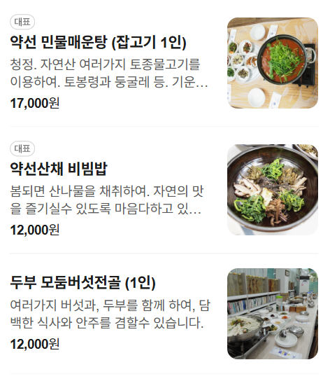 - 잡고기/메기 매운탕: 신선한 민물고기에 수제비를 띄워 얼큰하게 끓여냅니다. 흙냄새 없이 개운한 맛이 일품입니다.