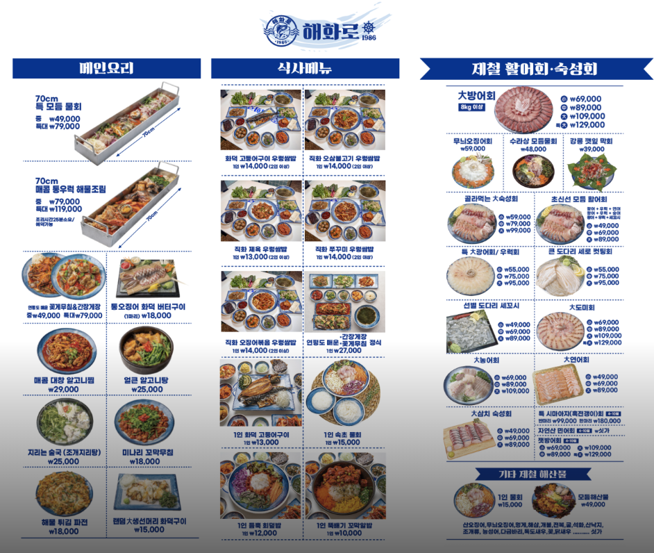 이곳은 상호(해화로)처럼 숯불구이와 회, 조림을 함께 즐길 수 있습니다.